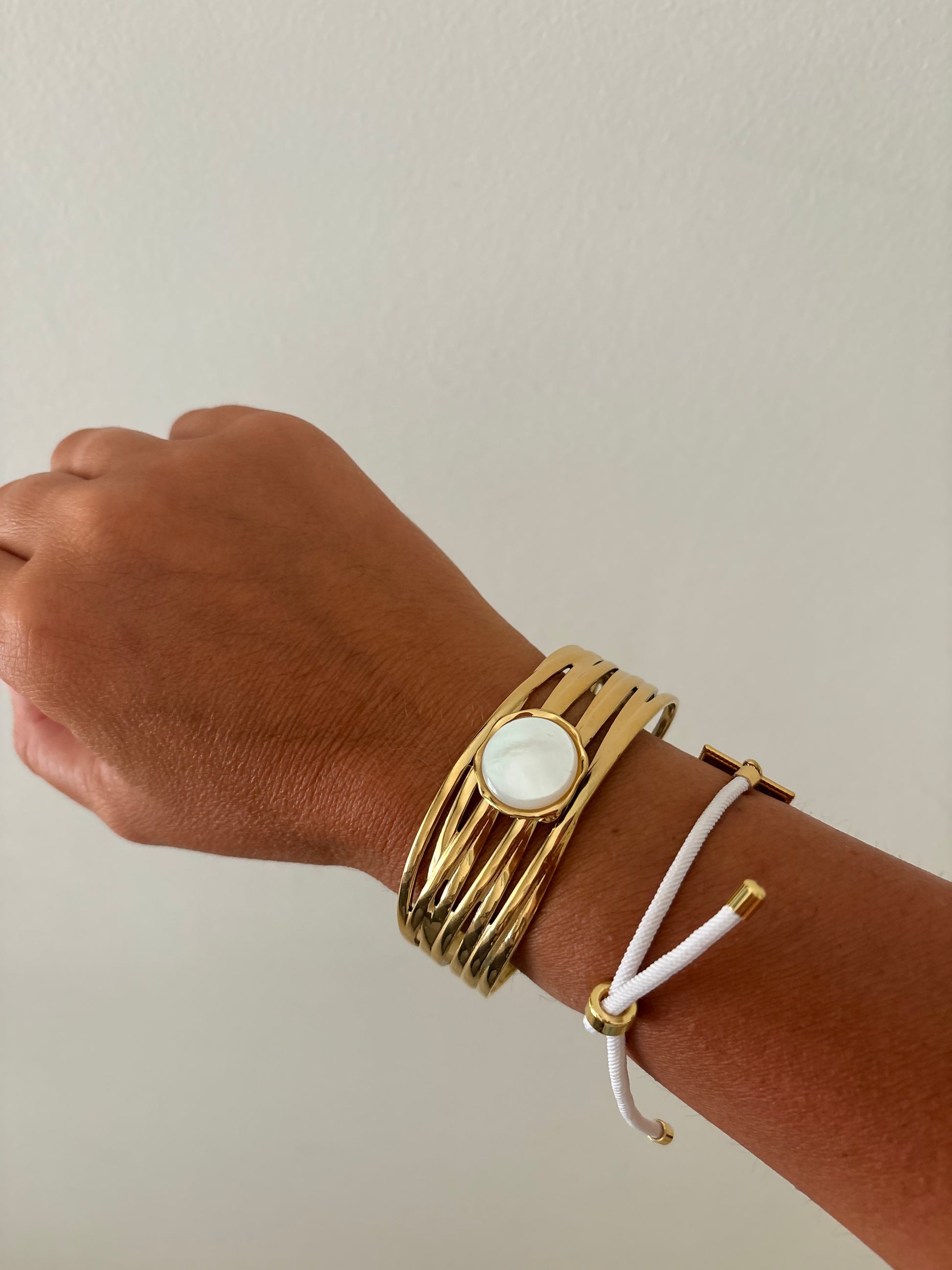 Bracciale rigido, regolabile, in acciaio inossidabile. Pietra bianca sintetica.