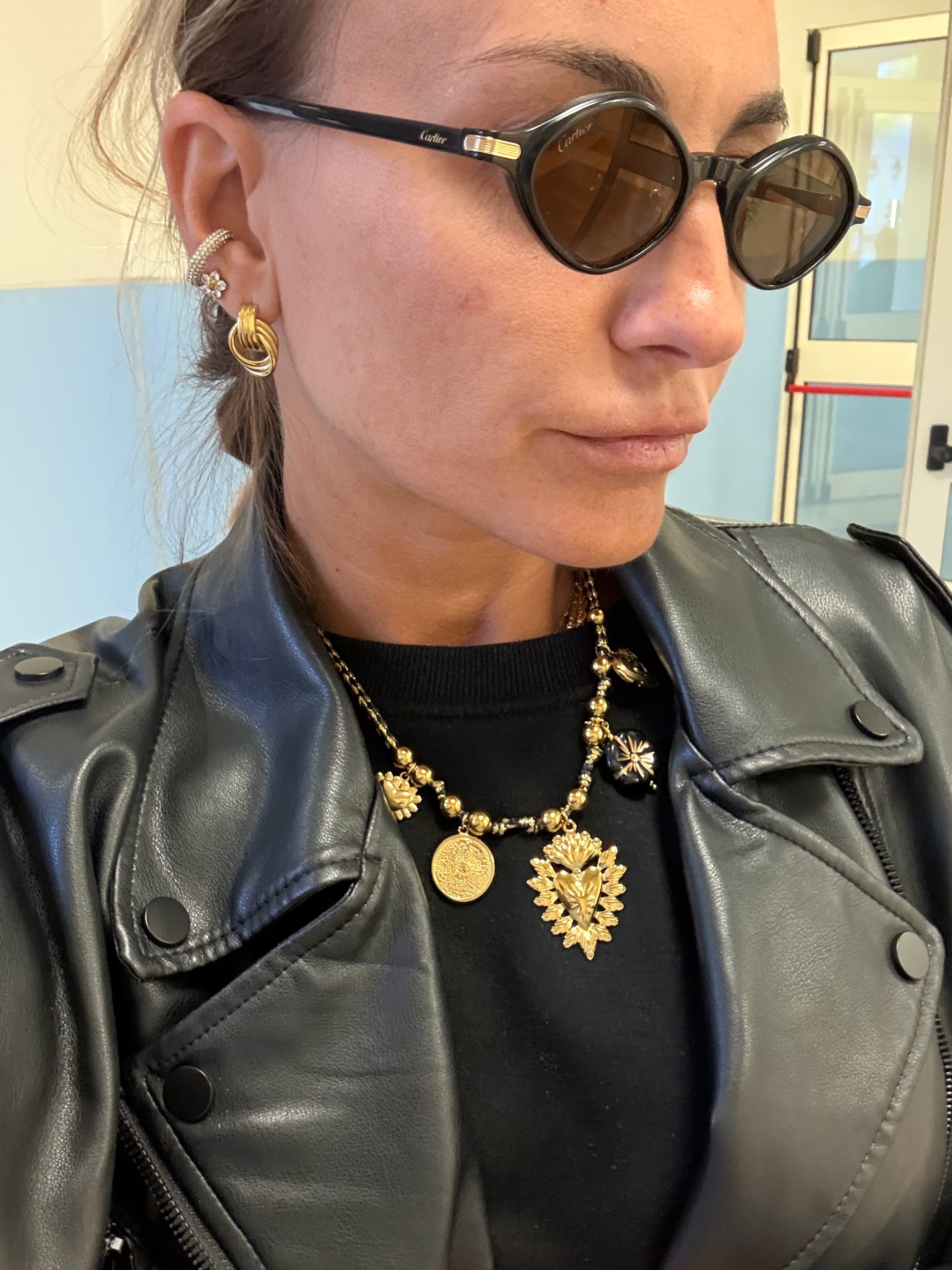 Collana con nastro in tessuto con fili laminati. Charms in acciaio inossidabile. Lunghezza 45 cm + 7 cm