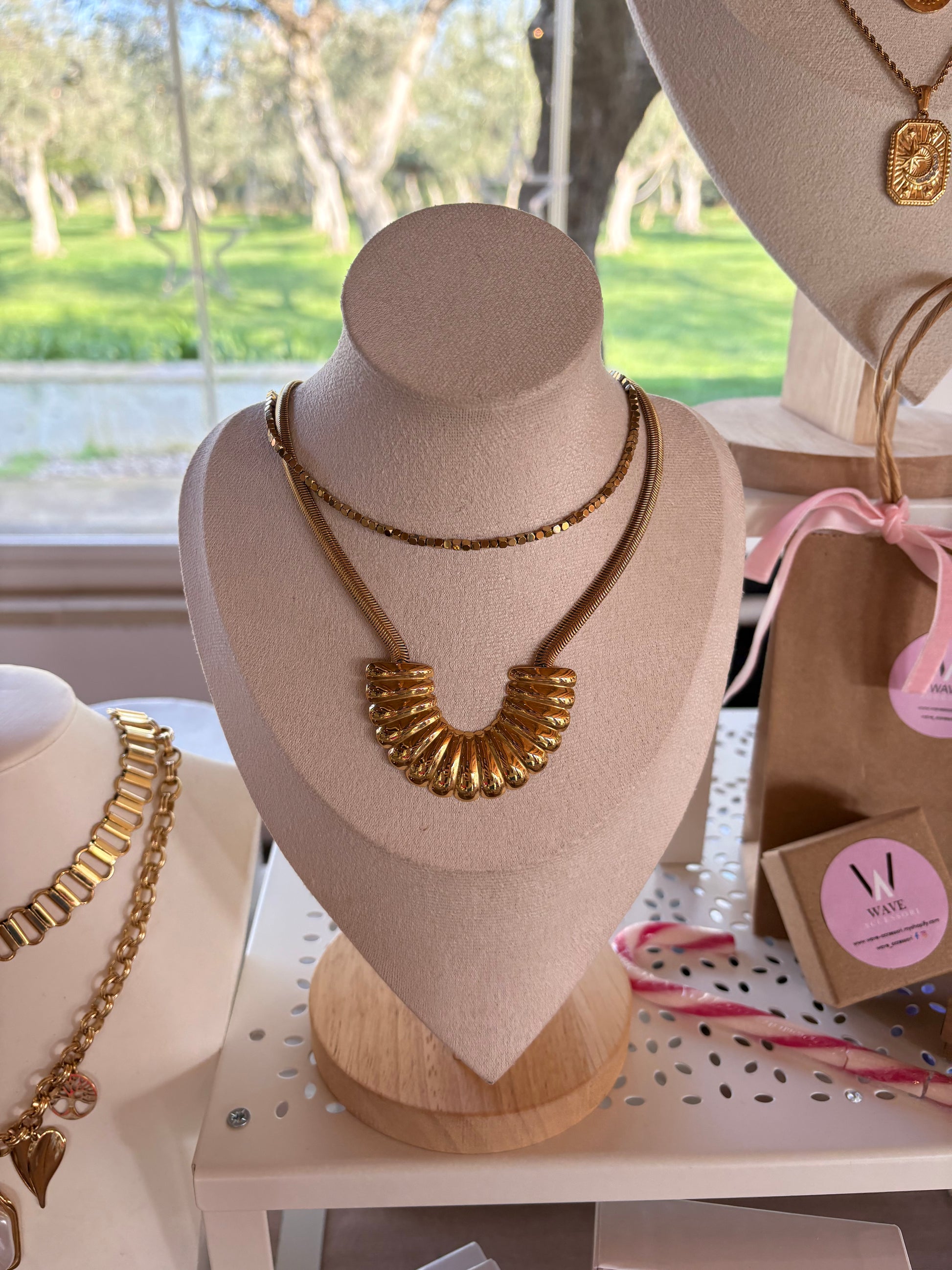 Il dettaglio sul davanti la rende particolare senza appesantirla, resta dunque molto leggera al collo.