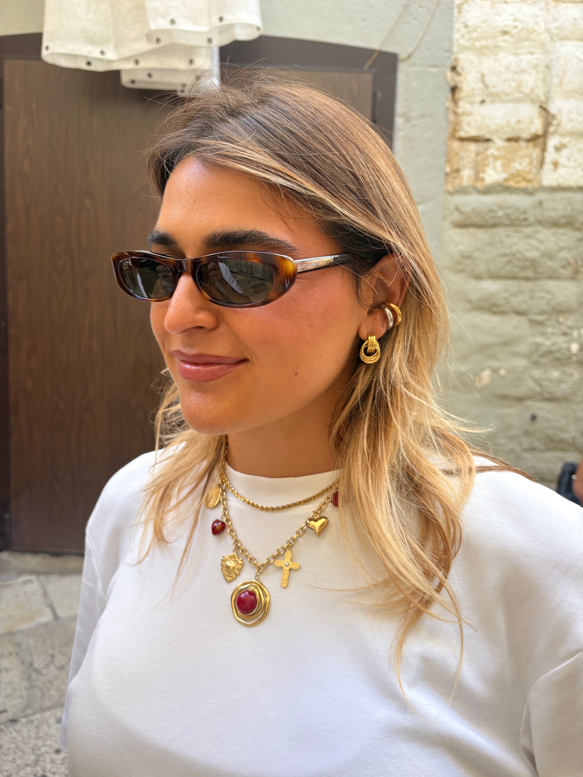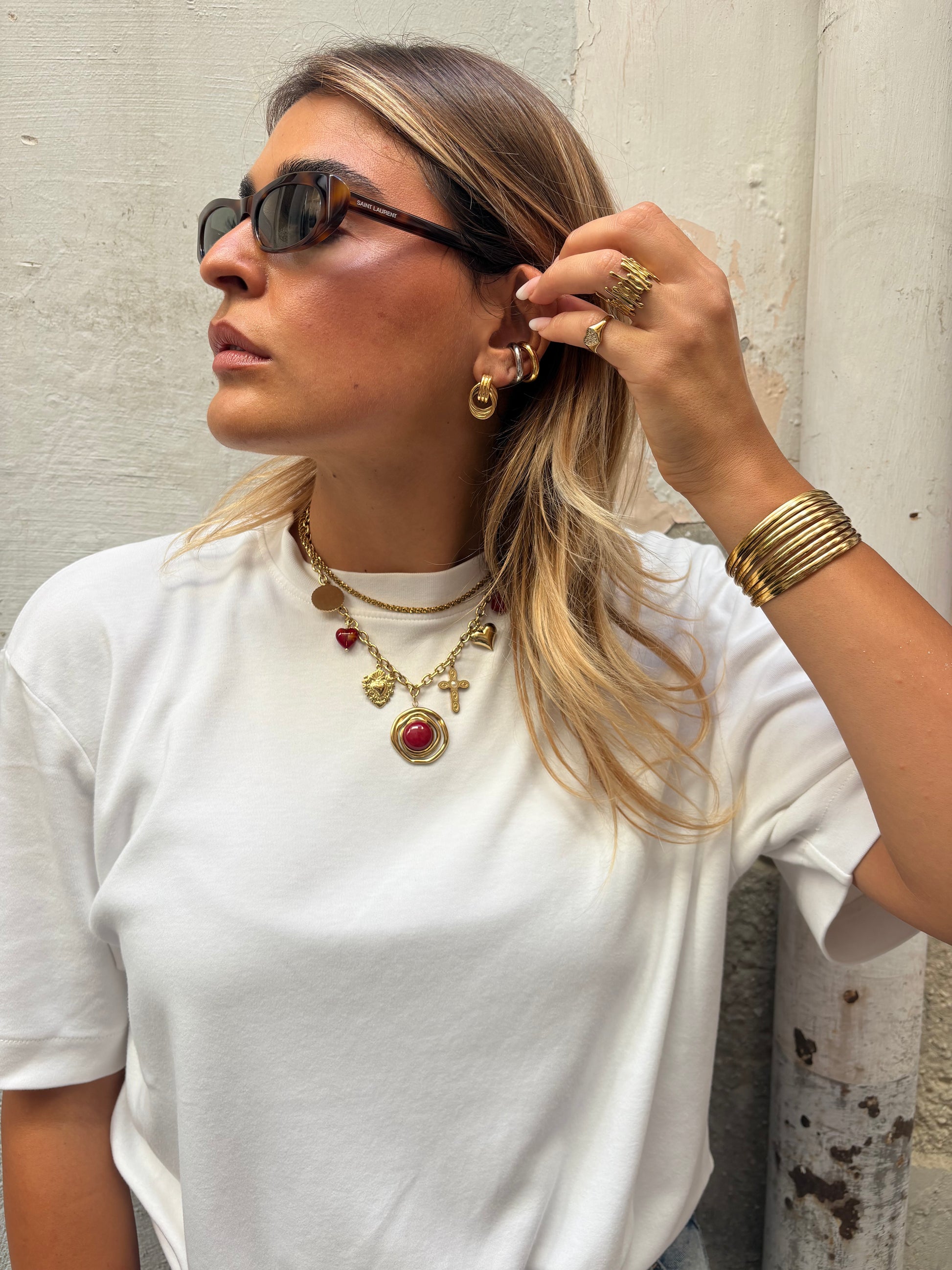 Collana con multi charms in acciaio inossidabile e pietre sintetiche e perle.